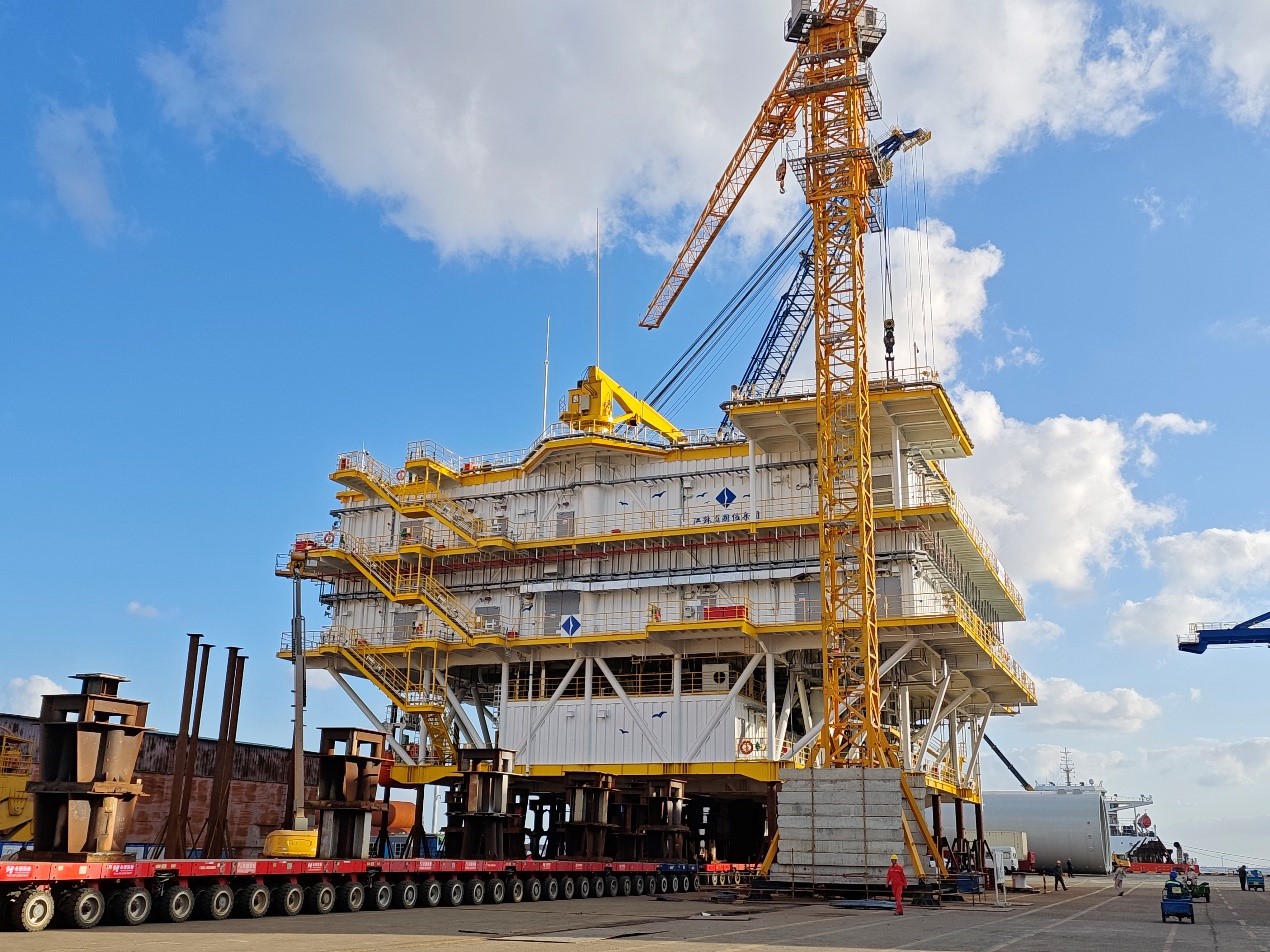 10月26日,由中国能建江苏院独立自主设计的国信大丰85万千瓦海上风电项目H1&H2升压站上部组块,在南通泰盛蓝岛海洋工程有限公司成功装船发运。这标志着项目近六个月陆上建造阶段收官,海上安装工作全面启动。